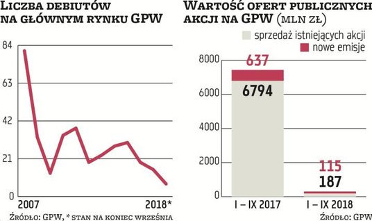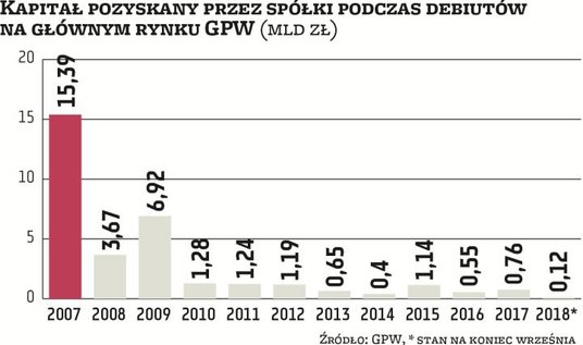 W tym roku spółki debiutujące na głównym rynku GPW pozyskały łącznie zaledwie 115 mln zł ze sprzedaży nowych akcji. Rok temu o tej porze było to prawie 640 mln zł. Łączna wartość ofert publicznych, towarzysząca tegorocznym debiutom, to 302 mln zł wobec aż 7,43 mld zł rok temu, gdy licznik podbiły duże oferty Playa, Dino Polska i GetBacku.