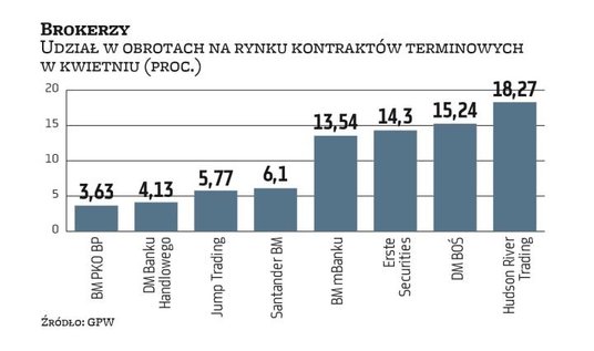 Już w styczniu Hudson River w maklerskim wyścigu na rynku kontraktów terminowych o włos wyprzedził DM BOŚ. Sytuacja powtórzyła się w lutym z tą różnicą, że przewaga była już nieco większa. W marcu, czyli w miesiącu wygasania kontraktów terminowych, krajowa branża wzięła rewanż, a konkretnie zrobiło to BM mBanku. W kwietniu Hudson River wrócił jednak już na szczyt. Zdobył 18,27 proc. udziałów w rynku. Drugie miejsce przypadło w udziale DM BOŚ, który miał 15,24 proc. udziałów. Na najniższym stopniu podium stanęło Erste Securities z wynikiem 14,3 proc.