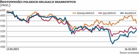 Dla polskiego rynku obligacji powyborczy poniedziałek był prawie najlepszym dniem w tym roku. Na otwarciu rynku dochodowość papierów dziesięcioletnich zniżkowała o około 20 pkt baz., do 5,66 proc. Dzienne minimum wypadło zaś 6 pkt baz. niżej. Nieco inaczej reagowały papiery krótkoterminowe – rentowność na krótkim końcu krzywej przesuwała się delikatnie w górę, do 5,31 proc. Poniedziałkowy spadek doprowadził dochodowość papierów dziesięcioletnich do poziomów z połowy września. Jeszcze na początku października wskaźnik ten chwilami przekraczał 6 proc.