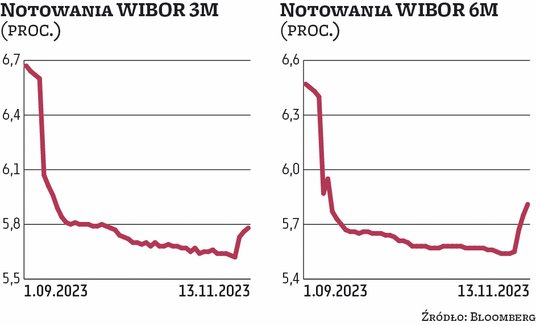 Od kilku dni wskaźniki WIBOR pną się powoli w górę. Według poniedziałkowych kwotowań WIBOR 3M wynosił 5,78 proc. wobec 5,62 proc. lokalnego dołka w połowie minionego tygodnia. WIBOR 6M wzrósł do 5,81 proc. wobec 5,54 proc. tydzień wcześniej. To istotna zmiana dotychczasowego zniżkowego trendu. Przypomnijmy, że notowania wskaźników WIBOR wyraźnie spadały od lipca tego roku.