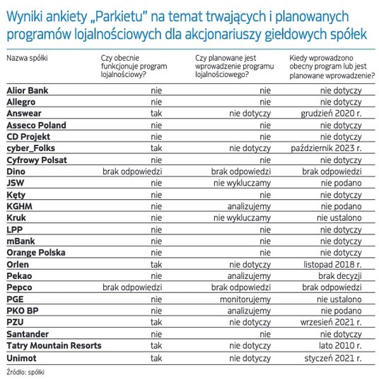 Jak na razie to wszystkie specjalne inicjatywy kierowane do akcjonariuszy przez spółki notowane na GPW. Tradycyjnie już „Parkiet” zapytał firmy, których akcje zaliczane są do indeksu WIG20, czy zamierzają wystartować z tego typu inicjatywą w najbliższym czasie. Wprawdzie KGHM, Pekao i PKO BP odpowiedziały, że analizują taką możliwość, JSW i Kruk jej nie wyklucza, a PGE monitoruje rynek, ale takie odpowiedzi z ich strony padają już od dawna. Co więcej, część z nich już nawet nie odpowiada, czy i jakie działania podjęły do dziś w zakresie programów lojalnościowych. Z kolei inne trudno uznać za mogące napawać optymizmem. „Dokonaliśmy przeglądu stosowanych praktyk polskiego rynku i efekty wdrażanych programów oraz przeanalizowaliśmy potencjalne zainteresowanie. W rezultacie kwestia nie została uznana za priorytetową w aktualnych relacjach z akcjonariuszami, natomiast temat nadal pozostaje przez nas stale monitorowany – twierdzi biuro prasowe PGE.