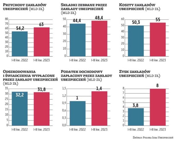 Danych za cały 2023 r. jeszcze nie ma, ale z przygotowanego przez Polską Izbę Ubezpieczeń podsumowania sytuacji na rynku ubezpieczeń po trzech jego kwartałach wynika, że był on dla ubezpieczycieli lepszy niż wcześniejszy. W ciągu pierwszych dziewięciu miesięcy 2023 r. zebrali oni 57,7 mld zł ze sprzedaży polis, o 9,4 proc. więcej niż rok wcześniej. Wypłacili 33,1 mld zł odszkodowań i świadczeń. To o 1,6 proc. mniej niż rok wcześniej. Zysk wypracowany przez zakłady ubezpieczeń wyniósł 8 mld zł, znacząco więcej niż rok wcześniej, gdy było to 3,8 mld zł.