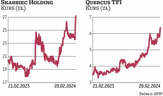 Jeśli sugerować się wycenami obu firm z rekomendacji BM Pekao, to mają one jeszcze niemałą przestrzeń do zwyżek. Analitycy docelową cenę akcji Skarbca Holdingu oszacowali na 33 zł, a Quercusa TFI na 6,7 zł. BM Pekao dla obu spółek zaleca oczywiście „kupuj”.