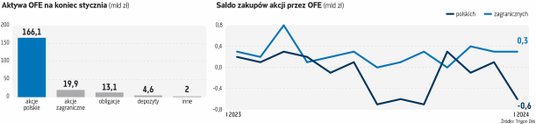 OFE są oczywiście kluczowym graczem na krajowym rynku akcji, a decyzje zarządzających istotnie oddziałują na zachowanie szerokiego rynku. Przykładowo w styczniu, w którym krajowy rynek złapał zadyszkę, OFE pozbyły się polskich akcji za około 0,6 mld zł. Podobnie było w III kwartale ub.r. W ostatnich trzech miesiącach 2023 r., kiedy polski rynek był bardzo mocny, OFE były już bardziej skłonne do zakupów.