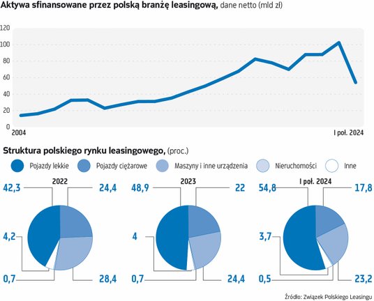 Od lat niezmienna pozostaje struktura finansowania aktywów przez firmy leasingowe. Największą część stanowią pojazdy – 73 proc., a następnie maszyny i inne urządzenia – 23 proc., inne transakcje razem z nieruchomościami to 4 proc. w tej strukturze. W I połowie 2024 r. firmy leasingowe sfinansowały pojazdy o wartości 39,9 mld zł (wzrost o 17,2 proc.), z czego na pojazdy lekkie przypadło 29,7 mld zł (wzrost o 32 proc.), a na ciężkie 9,6 mld zł (spadek o 14 proc.). Wyleasingowane maszyny i urządzenia miały wartość 12,6 mld zł (wzrost o 5 proc.), pozostałe ruchomości – 1,98 mld zł (wzrost o 5 proc.), a nieruchomości 0,29 mld zł (wzrost o 0,7 proc.).