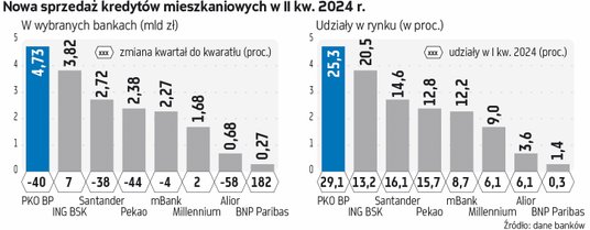 W poszczególnych bankach, zwłaszcza tych najbardziej zaangażowanych w „Bk2”, sytuacja jest jeszcze gorsza. Jak pokazuje nasza analiza, lider rynku, PKO BP, największy kredytodawca w Polsce, zanotował spadek kwartał do kwartału aż o 40 proc., a jego udziały w nowej sprzedaży skurczyły się do ok. 25 proc. ze średnio 30 proc. w okresach wcześniejszych. Teraz prezes PKO BP Szymon Midera zapowiada, że bank będzie się bił o powrót do wcześniejszej pozycji, jeśli chodzi udziały w rynku.