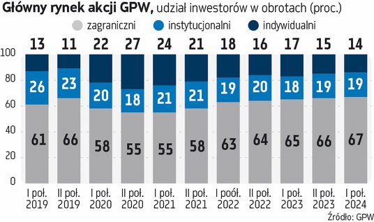 – Aktywność klientów detalicznych mierzona wartością wygenerowanych przez nich obrotów pozostała na poziomie zbliżonym do 2023 r., jednak łączna wartość obrotów na GPW w I półroczu 2024 r. była wyraźnie większa niż w II półroczu 2023 r. – o około 22 proc. Za zwiększonymi obrotami stoją przede wszystkim zdalni brokerzy obsługujący inwestorów zagranicznych, których udział w handlu na GPW był w ostatnich kwartałach rekordowo wysoki (odpowiadali oni za około 2/3 obrotów). Niepokojącym sygnałem jest brak wyraźnego wzrostu zainteresowania inwestowaniem na giełdzie w obliczu świetnych wyników indeksów GPW za ostatnie kilkanaście miesięcy. Tym razem pomimo trwającej już kilkanaście miesięcy hossy i świetnych wyników indeksów GPW reakcja inwestorów indywidualnych jest raczej mocno stonowana – wskazywał Skolik.