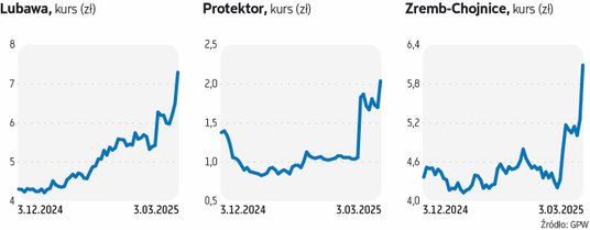 Na drugim biegunie podczas poniedziałkowej sesji były natomiast spółki, których biznes ma związek z wojskiem. To m.in. Protektor, Lubawa i Zremb-Chojnice. Protektor jest producentem obuwia dla służb mundurowych, takich jak policja, straż pożarna czy wojsko. Jego akcje po południu zyskiwały 20 proc. Był to największy wzrost podczas poniedziałkowej sesji na giełdzie. Zwyżce towarzyszył wysoki wolumen. Tylko w pierwszej połowie sesji jego wartość przekroczyła 2 mln zł.