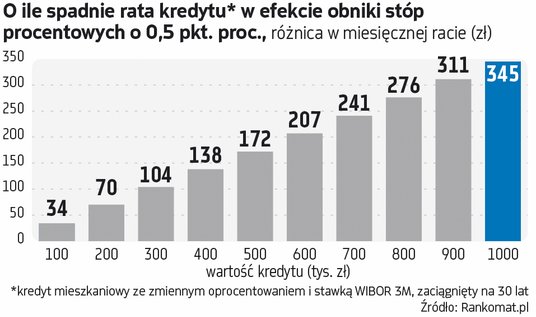 Przykładowo, przy kredycie na 500 tys. zł obecna rata to 3648 zł, a przez kolejne sześć miesięcy wynosić będzie 3370 zł, a więc o 278 zł mniej. Przy kredycie na 300 tys. zł miesięczne obciążenia spadną o 167 zł, do 2022 zł, a przy kredycie na 800 tys. zł – o 445 zł, do 5392 zł.