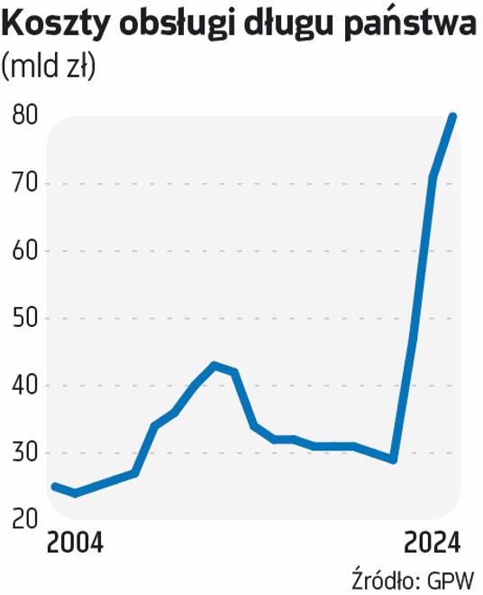 Wydatki na obsługę długu wyniosły w całym sektorze finansów publicznych około 80,2 mld zł w 2024 r. – wynika z danych Eurostatu. To o 13 proc. więcej niż w 2023 r., ale aż o 155 proc. więcej niż przed pandemią czy wybuchem wojny przeciw Ukrainie. Jeszcze w 2019 r. czy nawet 2021 r. obsługa długu kosztowała Polskę ledwie 30 mld zł.