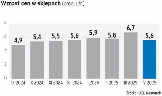 Spowolnienie inflacji wydają się potwierdzać dane z handlu. Kwietniowa dynamika wzrostu cen w sklepach wyniosła średnio 5,6 proc. r./r., czyli najmniej od początku roku. Dotyczyło to żywności, napojów bezalkoholowych i alkoholowych oraz pozostałego asortymentu, np. chemii gospodarczej czy art. dla dzieci. Tak wykazał cyklicznie wydawany raport pt. „Indeks cen w sklepach detalicznych”, autorstwa UCE Research i Uniwersytetu WSB Merito. W marcu codzienne zakupy zdrożały r./r. o 6,7 proc., w lutym – o 5,8 proc., a w styczniu – o 5,9 proc.