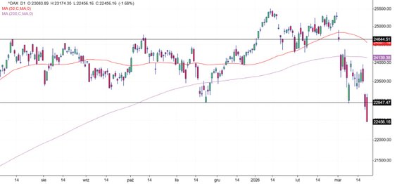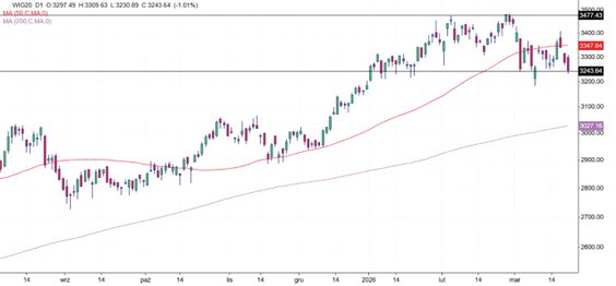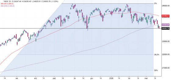 Na rynkach nie doszło jeszcze co prawda do paniki, aczkolwiek ponad 5-proc. przecena S&P 500 w marcu sprowadza główny amerykański indeks aż do listopadowych dołków. Poziom ten oczywiście może dać już do myślenia, zarówno inwestorom, jak i amerykańskiemu prezydentowi, natomiast jego przełamanie będzie kolejnym sygnałem do spadków. Podobnie prezentuje się Nasdaq, gdzie wsparcie w postaci listopadowego dołka na początku piątkowej sesji już trzeszczało.