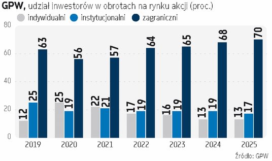 Wspomniany okres pandemii do dzisiaj zresztą jest wspominany przez maklerów z rozrzewnieniem. Wtedy to udział inwestorów indywidualnych w obrotach na głównym rynku akcji skoczył w 2020 r. aż do 25 proc., podczas gdy rok wcześniej uklepywaliśmy dno na poziomie 12 proc. W 2025 r. detal odpowiadał za 13 proc. obrotów na rynku akcji.