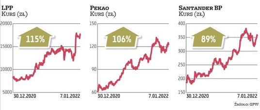 Wśród największych firm najbardziej okazałą stopę zwrotu przyniosły akcje LPP, zapewniając zysk na poziomie 115 proc. Kapitalizacja odzieżowego giganta przekroczyła 32 mld zł, plasując go w czołówce najbardziej wartościowych spółek z GPW. Właściciel kilku popularnych odzieżowych marek w zeszłym roku pozytywnie zaskoczył rynek wynikami, które były najlepsze w historii firmy. W ocenie analityków spółka ma szansę na kontynuację tego pozytywnego trendu. – LPP znajduje się na naszej liście faworytów na 2022 r. Spółka jest beneficjentem dużego rozwoju powierzchni handlowej, zwłaszcza w swoim najtańszym brandzie, jakim jest Sinsay. Jego rozwój jest znacząco tańszy niż dotychczasowy na przykład Reserved, a zwrot z inwestycji w retail parkach to 12–16 miesięcy. Ponadto, dynamicznie rośnie sprzedaż e-commerce. Koszty są powiązane z przychodami w znacznie większym stopniu niż przed pandemią, co sprawia, że model biznesowy jest bardziej elastyczny. Widać efekty wdrażania RFID, które w tym roku powinno być zakończone w Croppie, Housie, Mohito – wyjaśnia Sylwia Jaśkiewicz, analityk DM BOŚ. Spodziewa się dobrych wyników finansowych. Przekonuje, że wzrost powierzchni, zmiany w modelu biznesowym i w strukturze sprzedaży powinny więcej niż skompensować wzrost płac.