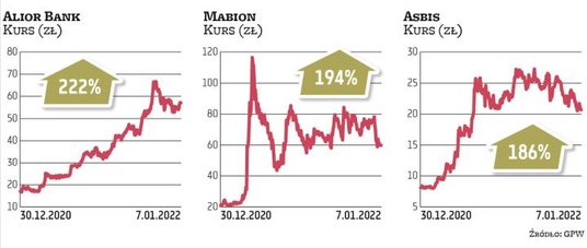Głównym motorem ubiegłorocznych zwyżek mWIG40 były banki. W czołówce spółek z najwyższą stopą zwrotu znalazł się Alior. W 2021 r. jego akcje wróciły do łask, co przełożyło się na imponujące zwyżki. W ocenie analityków akcje banku nie wyczerpały jeszcze swojego potencjału, podkreślając, że prezentuje się on atrakcyjniej niż inni konkurenci z sektora. – Akcje Aliora postrzegamy jako atrakcyjne względem pozostałych banków, biorąc pod uwagę wysoką wrażliwość wyniku na oczekiwane podwyżki stóp procentowych oraz niższą prognozowaną wycenę wskaźnikową względem średniej dla indeksu WIG-banki – wskazuje Michał Krajczewski, analityk BM BNP Paribas.
