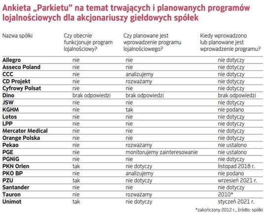 Z przeprowadzonej po raz kolejny przez „Parkiet" ankiety wśród spółek, których akcje są zaliczane do indeksu WIG20, wynika, że zainteresowanie wprowadzeniem przez nie programów lojalnościowych dla akcjonariuszy spada. Dziś jedynie KGHM wprost deklaruje, że planuje taki projekt. Podobnie odpowiadał też w przeszłości. „KGHM podtrzymuje chęć i kontynuuje działania w kierunku przygotowania odpowiedniej dla inwestorów oferty lojalnościowej, jednakże wspominany już w poprzedniej deklaracji czynnik niepewności, wynikający z sytuacji pandemicznej, ciągle proces ten przesuwa w czasie. Koncentrujemy się aktualnie na realizacji obowiązującej strategii i stabilizacji czynników wzrostu wartości firmy dla wszystkich jej interesariuszy" – informuje departament komunikacji KGHM.