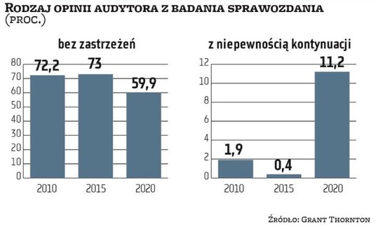 W 2020 r. tylko 85 proc. sprawozdań nie wzbudziło żadnych wątpliwości czy zastrzeżeń biegłych rewidentów. W 2015 r. i 2010 r. odsetek ten był znacząco wyższy i wynosił odpowiednio 98 i 94 proc. W 2020 r. aż ponad 11 proc. opinii z badania zawierało uwagę audytora o tzw. niepewności związanej z możliwością kontynuacji działalności przez spółkę. W poprzednich badanych latach odsetki te były znikome, oscylowały w okolicach 1–2 proc.