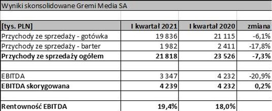 Przychody barterowe skurczyły się o 17,8 proc., do 1,98 mln zł, z uwagi na dalsze ograniczenia wymiany barterowej świadczeń marketingowych w związku z pandemią. Przychody gotówkowe obniżyły się o 6,1 proc., do 19,8 mln zł.