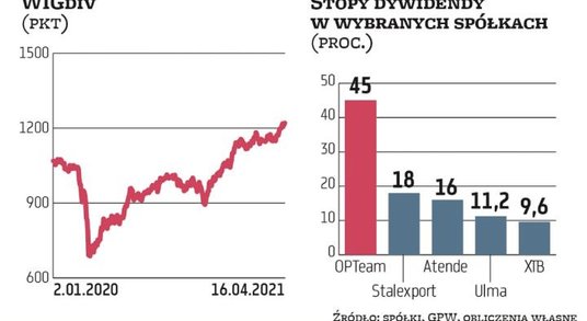 Jak już zapowiadaliśmy, zdecydowanym liderem pod względem stopy dywidendy jest w tym roku technologiczny OPTeam, który dzieli się z akcjonariuszami zastrzykiem gotówki po zeszłorocznej sprzedaży udziałów w ePłatnościach. Wypłaci w formie dywidendy w sumie ponad 212 mln zł, co daje 26,98 zł na akcję. W tej kwocie mieści się już 14,98 zł zaliczki wypłaconej 31 grudnia 2020 r. Do wypłaty zostaje zatem 12 zł. Dniem ustalenia prawa do tej kwoty jest 19 kwietnia, a wypłata ma nastąpić 27 kwietnia.