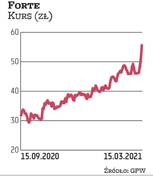 Po przejściowych kłopotach wywołanych pierwszym lockdownem w kolejnych kwartałach zamówienia Forte bardzo szybko się odbudowały, a branża meblowa nieoczekiwanie stała się beneficjentem pandemii i zmiany nawyków konsumentów. Druga fala pandemii nie zakłóciła funkcjonowania zakładów meblarskiej grupy. Dodatkowym wsparciem był wysoki kurs euro. – Obecnie czynniki te dalej wspierają notowania spółki, a zakupy jej głównego akcjonariusza i prezesa mogą potwierdzać pozytywne tendencje – zauważa Krystian Brymora, analityk DM BDM.