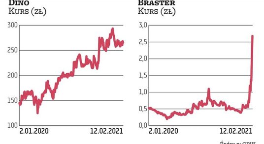 W przypadku niektórych spółek zawiadomień było kilka. Przykłady? Systematycznie akcje swojej firmy skupują z rynku insiderzy Brastera. Takie raporty trafiały na rynek m.in. w styczniu, a od początku lutego pojawiło się kilka kolejnych. Walory nabywają zarówno przedstawiciele zarządu, jak i rady nadzorczej. Wspiera to notowania, które od kilkunastu dni mocno zyskują na wartości. Wcześniej oscylowały w przedziale 0,5–0,7 zł, jednak pod koniec stycznia na rynek trafiła informacja o możliwej umowie z inwestorem (Braster jest w trakcie restrukturyzacji) i wtedy notowania poszybowały. W piątek po południu sięgały 2,6 zł.