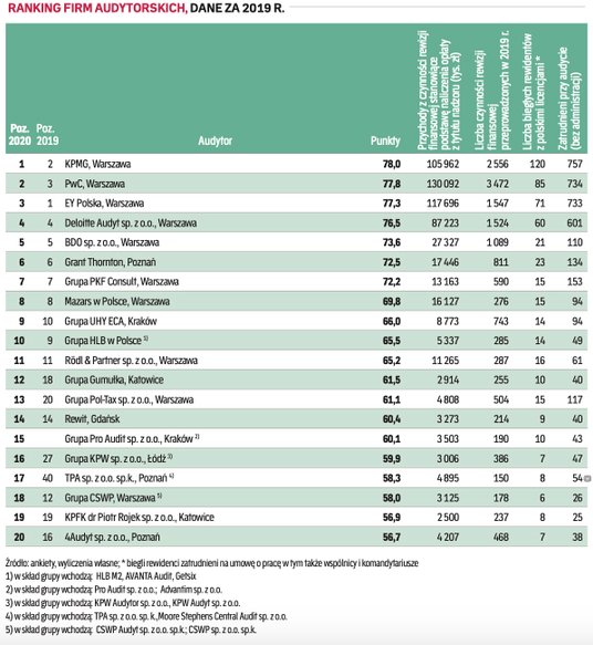 KPMG już wielokrotnie wygrywało w rankingu. Teraz przejęło pałeczkę lidera od zeszłorocznego zwycięzcy, czyli firmy EY. W tegorocznej edycji awansowało również PwC. Ma drugie miejsce, podczas gdy rok temu było na trzecim. Teraz natomiast trzecia pozycja przypadła wspomnianej już firmie EY, a za nią uplasowało się Deloitte. Co ciekawe, miejsca od czwartego do ósmego przypadły tym samym podmiotom co przed rokiem. Odpowiednio są to: wspomniany Deloitte, BDO, Grant Thornton, Grupa PKF Consult i Mazars. Natomiast lokatami zamieniły się firmy zamykające pierwszą dziesiątkę: UHY ECA (teraz jest dziewiąta) i HLB (dziesiąta).