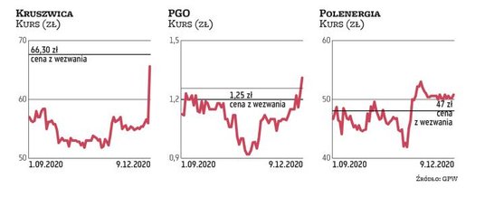 Nowe wezwania wpisują się w trend, jaki panuje na GPW od kilku dobrych lat. Tylko od początku 2020 r. ogłoszono już ponad 30 wezwań do sprzedaży akcji spółek. Wciąż ważą się losy pięciu innych wezwań, opiewające na ok. 1,2 mld zł. Największe (1,03 mld zł) dotyczy Polenergii. Z reakcji rynku można wywnioskować, że oferta BIF IV Europe Holdings i Mansa Investments nie jest zbyt atrakcyjna dla pozostałych akcjonariuszy. W trakcie środowej sesji papiery były notowane nawet po 53 zł, czyli aż około 13 proc. powyżej ceny z wezwania. Rynek oczekuje więc, że cena w wezwaniu głównego akcjonariusza zostanie wyraźnie podniesiona. Zapisy w wezwaniu potrwają od 10 grudnia br. do 11 stycznia 2021 r.