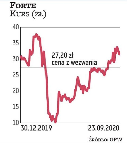 Zarząd meblarskiej grupy uważa, że wezwanie ogłoszone przez głównego akcjonariusza jest zgodne z interesem spółki, a cena akcji odpowiada wartości godziwej spółki. Wprawdzie oferta daje niemałą premię względem sześciomiesięcznej średniej ceny rynkowej (21,20 zł), zdaniem analityków jednak można znaleźć argumenty przemawiające za jej podniesieniem i należy ją traktować jako punkt wyjścia do dalszych negocjacji. Mimo przejściowego kryzysu, wywołanego wiosennym lockdownem gospodarek, w ostatnich miesiącach z Forte napływały optymistyczne informacje.
