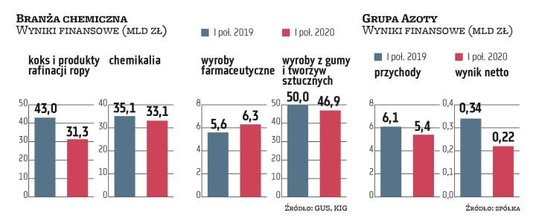 Wartość produkcji sprzedanej polskiej chemii w I połowie 2020 r. spadła o 16 mld zł, do 117,6 mld zł, w porównaniu z rokiem ubiegłym. Spadki zanotowały trzy z czterech głównych gałęzi tego przemysłu, jedynie produkcja wyrobów farmaceutycznych osiągnęła wzrost. Jaka podaje PIPC, sytuacja w całej branży chemicznej nadal jest poważna, a negatywny wpływ pandemii wciąż jest zauważalny. W I półroczu najtrudniejszym miesiącem był kwiecień, bo wtedy zaobserwowano największe spadki sprzedaży. Obecnie wskaźniki powoli się poprawiają. Część firm jednak ograniczyła lub planuje ograniczyć inwestycje, branża wprowadza też plany racjonalizacji kosztów.