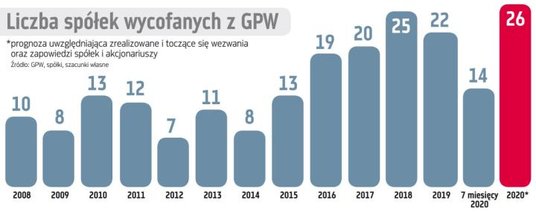 Jeśli toczące się teraz wezwania zakończą się po myśli przejmujących (oraz jeśli dojdzie do delistingu tych spółek, w których wezwania w minionych miesiącach już się zakończyły), to w tym roku główny parkiet opuścić może około 26 firm – wynika z naszych szacunków. Niewykluczone, że będzie ich jeszcze więcej, bo statystyki mogą podbić bankruci (znikają z obrotu giełdowego po sześciu miesiącach od uprawomocnienia się decyzji sądu). Nawet jeśli delistingów w 2020 r. byłoby „tylko" 26, to i tak byłaby to najwyższa liczba w historii warszawskiej giełdy. Do tej pory rekordowy pod tym względem był rok 2018, kiedy parkiet główny opuściło 25 spółek.
