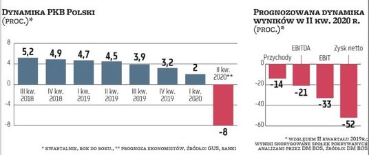 Z szacunków DM BOŚ wynika, że powtarzalny zysk netto giełdowych spółek w ujęciu rocznym obniżył się o połowę, a powtarzalny zysk operacyjny skurczył się o jedną trzecią. W rozbiciu na sektory ich zdaniem największe pogorszenie powtarzalnych zysków dotknie spółki z branży dóbr konsumenckich (oczekiwany spadek ok. 80 proc. r./r. na poziomie operacyjnym i netto), spółki wydobywcze (oczekiwane straty operacyjne i netto w porównaniu z ok. 1,06 mld zł zysku operacyjnego i 0,83 mld zysku netto w II kw. 2019 r.), spółki chemiczne (spadek na poziomie operacyjnym i netto odpowiednio o ok. 70 proc. i 75 proc.), spółki paliwowe (spadek o prawie 70 proc. na poziomie operacyjnym i poziomie netto) oraz banki (spadek wyniku netto o 48 proc.).
