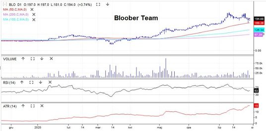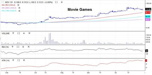Akcje producenta gier są nominalnie najdroższe z całej siódemki. Kurs akcji porusza się w trendzie wzrostowym ponad wstęgą średnich kroczących z 50, 100 i 200 sesji. Ostatnia korekta schłodziła RSI(14), ale ATR(14) pokazuje wysoką zmienność.