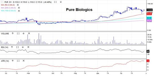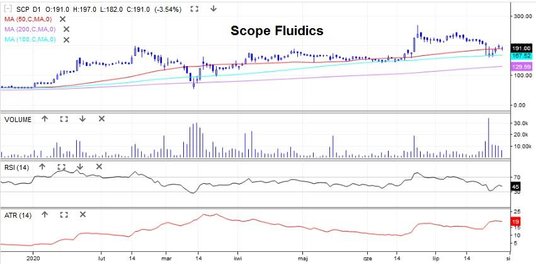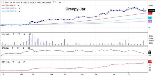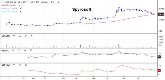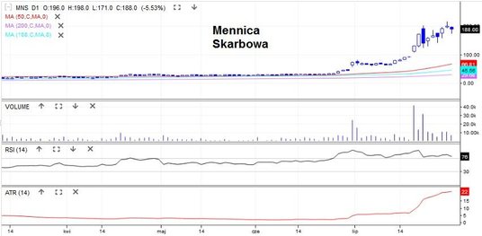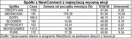Tytułowa siódemka to Creepy Jar (1165 zł), Mennica Skarbowa (195 zł), Scope Fluidics (189,5 zł), Bloober Team (194 zł), Spyrosoft (152 zł), Movie Games (112,5 zł) oraz Pure Biologics (112 zł). Pod względem zmiany notowań od początku lipca najsilniejsza jest Mennica (+176 proc.), a najsłabszy Spyrsoft (-14,6 proc.). Średnia zmiana dla całej siódemki wynosi natomiast +28 proc. Co ciekawe – Mennica jest też jedynym podmiotem z tej grupy, który według oscylatora RSI(14) jest w krótkim terminie wykupiony. Jego wartość sięga bowiem 81,6 pkt, podczas, gdy średnia dla pozostałych to 48,4 pkt. Pod względem zmienności, mierzonej jako procentowa relacja wskaźnika ATR(14) do ostatniej ceny zamknięcia, najbardziej rozchwiana również jest Mennica (10,6 proc.). Ponad 9-proc. Wahania notują też Creepy Jar oraz Pure Biologics). Szczegóły są w tabelce.