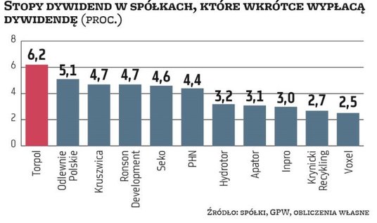 Pospieszyć muszą się inwestorzy, którzy chcą dostać dywidendy od takich spółek, jak Torpol, Krynicki Recykling czy Inpro. W ich przypadku dzień ustalenia prawa do wypłaty przypada na ten tydzień. Warto zwrócić uwagę szczególnie na tę pierwszą z powodu oferowanej przez nią stopy. Przy poniedziałkowej cenie akcji sięgającej 15 zł i uchwalonej dywidendzie w wysokości 0,9 zł na akcję otrzymujemy wskaźnik przekraczający 6 proc. Dniem dywidendy będzie 31 lipca, ale na konta gotówka popłynie stosunkowo późno: 30 października. W 2019 r. Torpol wypłacił w formie dywidendy ponad 5,7 mln zł, czyli 0,25 zł na akcję. W tym roku łączna kwota przekroczy 20,6 mln zł.
