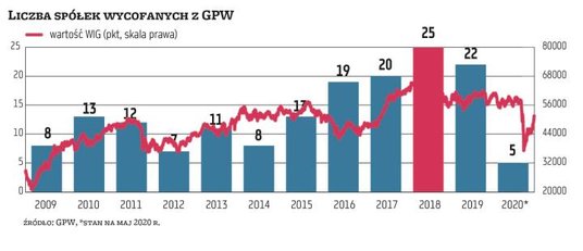 Znaczący uszczerbek w kapitalizacji GPW przyniesie w szczególności delisting wspomnianego już Orbisu (notowanego od 1997 r.). W połowie grudnia zeszłego roku AccorInvest Group wezwał do sprzedaży ponad 46 mln akcji Orbisu po 115 zł za sztukę. Przyjmowanie zapisów rozpoczęło się 5 lutego i trwało do 5 marca. W wezwaniu przejmujący skupił 45,4 mln papierów. Od 9 kwietnia – w związku z planowanym wtedy przymusowym wykupem – notowania Orbisu są zawieszone. Na rynku po raz ostatni transakcje zawierano po 113 zł, co przekłada się na kapitalizację rzędu 5,2 mld zł.