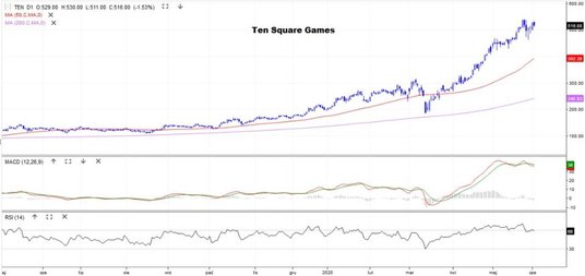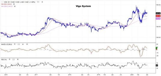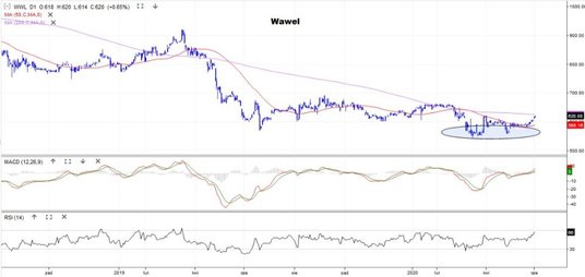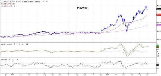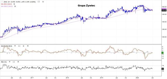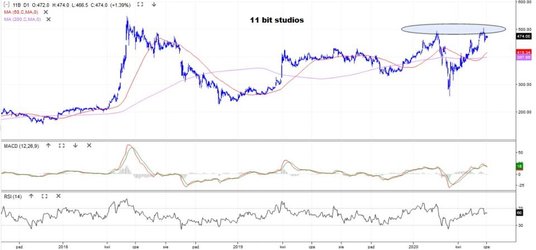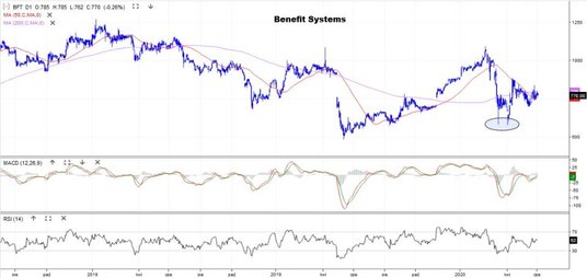 Drugie miejsce w zestawieniu ma Benefit Systems, zajmujący się pozapłacowymi świadczeniami dla pracowników (znany z kart Benefit). We wtorek za papier płacono 770 zł, a historyczne maksimum to 1270 zł. Na przełomie marca i kwietnia kurs utworzył podwójne dno i próbuje wrócić na ścieżkę wzrostu. Obecnie zmaga się ze średnimi z 50 i 200 sesji.