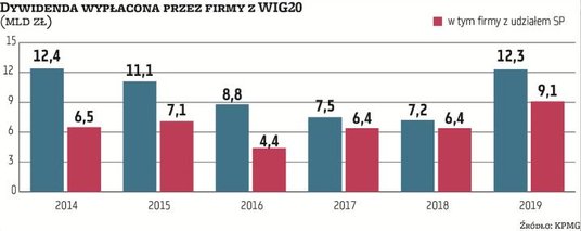 Od poniedziałku WIG20 stracił 7 proc. i jest najniżej od trzech lat. Jeśli sytuacja na globalnych rynkach się uspokoi, impulsem do wzrostu notowań blue chips mogłyby być informacje o dywidendach. Wiele jednak wskazuje, że w tej kwestii więcej będzie rozczarowań niż pozytywnych zaskoczeń – szczególnie ze strony spółek z udziałem Skarbu Państwa (w 2019 r. odpowiadały za 74 proc. wszystkich wypłat w WIG20). Już w ustawie budżetowej na 2020 r. założono znacząco niższe wpływy z tytułu dywidend niż rok wcześniej.