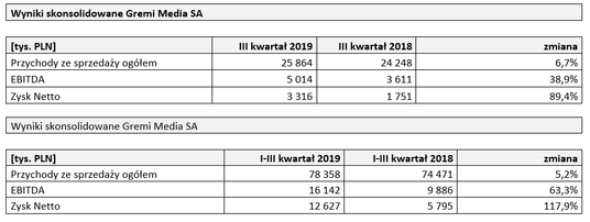 Imponujące wzrosty widać też w ujęciu minionych trzech kwartałów. Między styczniem i wrześniem Grupa Gremi S.A. osiągnęła ponad dwukrotny wzrost zysku netto (z 5,79 do 12,62 mln złotych) oraz ponad 60-procentowy wzrost zysku EBIDTA w porównaniu do tego samego okresu w 2018 r. Zarówno w ujęciu trzech kwartałów, jak i minionego kwartału Grupa zanotowała kilkuprocentowy wzrost przychodów ze sprzedaży.