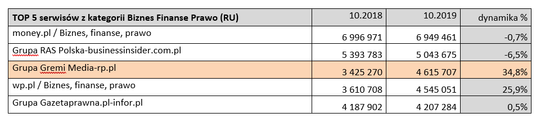 w analogicznym okresie 2018 roku. Wśród najchętniej odwiedzanych serwisów w kategorii Biznes Finanse Prawo znów zajął miejsce na podium, ustępując wprawdzie Money. pl (Grupa WP) oraz BusinessInsider.com. pl (Grupa RAS Polska), ale jako jedyny z tej trójki utrzymał tendencję wzrostową w porównaniu z zeszłym rokiem (Money.pl i BusinessInsider.pl straciły użytkowników). Rp.pl wyprzedził natomiast między innymi konkurencyjne serwisy gazetaprawna.pl i infor.pl (Grupa Infor PL). Skokowo wzrosła też liczba użytkowników rp.pl korzystających z urządzeń mobilnych (67 proc. do 3,2 mln).
