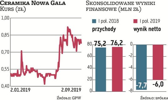 Podczas poniedziałkowych notowań kurs akcji Ceramiki Nowej Gali zniżkował przed południem nawet do 0,73 zł, czyli o 9,9 proc. Zdecydowana przewaga podaży to następstwo opublikowania przez spółkę słabszych wyników od oczekiwanych oraz opinii wyrażonej przez biegłego rewidenta, który zwraca uwagę na istniejące przesłanki dotyczące zagrożenia kontynuacji działalności i związaną z tym niepewność. Przesłanki te dotyczą prawie 6 mln zł skonsolidowanej czystej straty wykazanej w I półroczu oraz 35,4 mln zł straty poniesionej łącznie w latach 2016–2018.