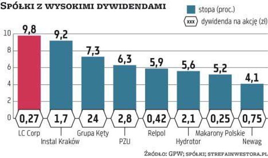 Na ponad 5-proc. stopy w tym roku mogą też liczyć akcjonariusze takich spółek, jak LC Corp, Instal Kraków, Grupa Kęty, PZU, Relpol, Hydrotor czy Makarony Polskie. W przypadku tej pierwszej premia z zeszłorocznego zysku zostanie wypłacona 30 sierpnia. Na akcję przypadnie 0,27 zł. Dzień ustalenia prawa do wypłaty uchwalono na 19 sierpnia. Rok temu dywidenda w LC Corp była niższa i wynosiła 0,24 zł na walor. Z kolei w Instalu wypłata będzie później, dopiero 10 września, natomiast dniem ustalenia prawa do niej jest 27 sierpnia. Nie zawsze akcjonariusze są jednomyślni co do podziału zysku. I tak na przykład w Instalu ostatecznie przegłosowano propozycję dotycząca wypłaty ponad 12 mln zł, czyli 1,7 zł na akcję. Ale pod uwagę brano również poziom 1,2 zł (propozycja zarządu) i 3 zł (propozycja części akcjonariuszy).