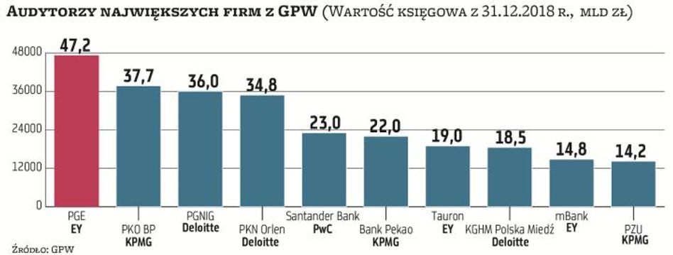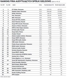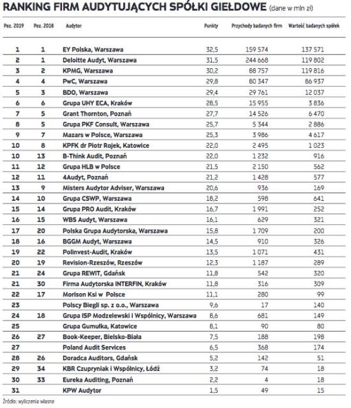 W tegorocznej edycji uwzględnialiśmy dane za 2018 r., a w przypadku ich braku – za 2017 r. Braliśmy pod uwagę firmy audytorskie, które przebadały raporty roczne przynajmniej dwóch spółek notowanych na GPW na koniec 2018 r. W tegorocznym zestawieniu pierwsza pozycja w rankingu przypadła EY. Rok temu firma ta również była na pozycji lidera, ale taką samą liczbę punktów uzyskało wtedy Deloitte, więc mieliśmy dwóch zwycięzców. W tegorocznej edycji Deloitte jest drugie, a za nim uplasowała się grupa KPMG.