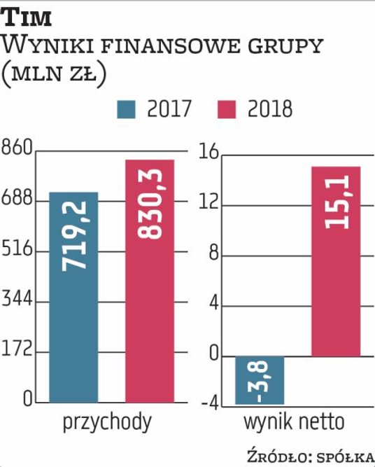 W 2018 r. Tim wypracował rekordowe przychody sięgające 751,5 mln zł. To o 15 proc. więcej niż rok wcześniej. Zysk netto spółki poprawił się w tym czasie do 10,2 mln zł, podczas gdy w 2017 r. było to zaledwie 0,7 mln zł. Natomiast obroty całej grupy wzrosły o 15 proc., do 830,2 mln zł. Grupa zarobiła na czysto 15,1 mln zł, a w 2017 r. miała 3,8 mln zł straty netto.