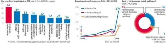 O ile wcześniej 40–50 firm rocznie ogłaszało raporty dotyczące ich działalności społecznej, środowiskowej czy filantropijnej, o tyle w ub.r. – jak podaje Komisja Nadzoru Finansowego – ukazały się aż 174 takie publikacje. Zdecydowaną większość, bo 160, wydały spółki giełdowe, które często robiły to o raz pierwszy.