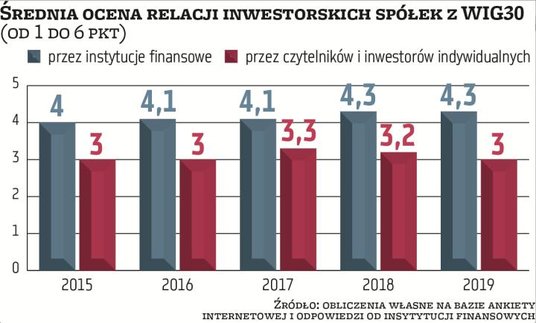 Przede wszystkim widać coraz większy rozdźwięk pomiędzy oceną relacji inwestorskich przez instytucje i drobnych graczy. Wiele przemawia za tym, że spółki zaniedbują tę ostatnią grupę. Jeszcze dwa lata temu inwestorzy indywidualni oceniali komunikację spółek z rynkiem średnio na 3,3 pkt (na maksymalnie 6 pkt). Rok temu na 3,2 pkt, a w tegorocznym badaniu ocena spadła do 3 pkt. Natomiast relacje firm z instytucjami przez ostatnie lata wyraźnie się poprawiły. Jeszcze cztery lata temu analitycy i zarządzający przyznali średnio spółkom równą czwórkę, w kolejnych dwóch latach było to 4,1 pkt, a w ubiegłym roku rekordowe 4,3 pkt. Ten wynik udało się utrzymać w tegorocznej edycji badania.