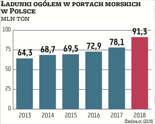 Na podobną zwyżkę wskazują najnowsze dane opublikowane przez GUS. Według tej instytucji ładunki ogółem załadowane i wyładowane w portach morskich w Polsce wyniosły w 2018 r. ponad 91,3 mln ton (poprawa o prawie 17 proc.). Wprawdzie GUS obejmuje swym badaniem również inne porty (Police, Kołobrzeg), ale stosuje inną metodologię, dlatego podane przez niego liczby są inne niż rządowe.
