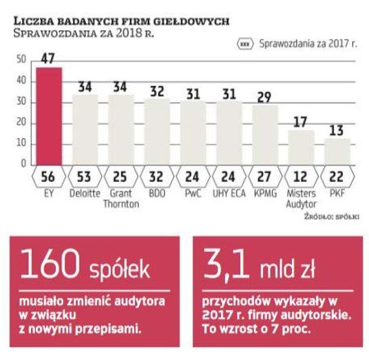 Tzw. wielka czwórka, czyli Deloitte, EY, KPMG i PwC, nadal ma mocną pozycję, ale w siłę wyraźnie rosną audytorzy średniej wielkości. Według najnowszych danych najwięcej giełdowych spółek na koncie mają: EY, Deloitte, Grant Thornton, BDO, UHY ECA, PwC i KPMG. Ta pierwsza wyraźnie wiedzie prym, mimo iż liczba jej klientów rok do roku spadła. Jeszcze większy spadek zanotowało Deloitte. Przedstawiciele branży nieoficjalnie mówią, że to skutek afery GetBacku (Deloitte był audytorem tej firmy). Deloitte, poproszony o komentarz, wskazuje na zmiany w ustawie.