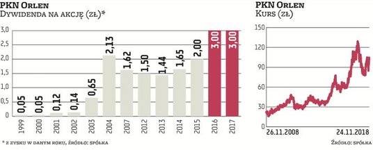 PKN Orlen dywidendę wypłaca nieprzerwanie od kilku lat. Trzy lata temu jej wartość wyniosła 1,65 zł na akcję, a dwa lata temu 2 zł. Z kolei w ubiegłym i w tym roku na każdy walor przypadało po 3 zł. Stopa dywidendy w ostatnich pięciu latach kształtowała się między 2,40 proc. a 3,6 proc. To niezły wynik, który dołożył się do wysokiej stopy zwrotu z inwestycji w akcje płockiego koncernu (łącznie przez pięć lat wyniosła 150 proc.). Dywidenda pozwala więc nie tylko zarabiać na wzroście kursu akcji, ale stanowi też regularny dochód bez konieczności ich sprzedaży. Wyższe stopy dywidendy z WIG20, czyli największych spółek na GPW, zaoferowały w tym roku tylko Pekao (7,8 proc.), PZU (6,3 proc.) i Eurocash (4 proc.).