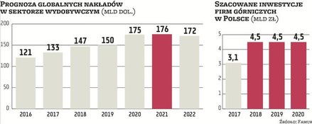 W 2018 r. inwestycje firm wydobywczych w Polsce wzrosną do 4,5 mld zł i będą o 48 proc. wyższe niż przed rokiem – wynika z prognoz Famuru, największego krajowego producenta maszyn górniczych. Taki poziom nakładów ma utrzymać się co najmniej do 2020 r. Rosną także górnicze inwestycje w skali globalnej – średniorocznie o 6 proc., aż osiągną 176 mld dol. w 2021 r. Dynamiczny wzrost inwestycji firm wydobywczych prognozowany jest zwłaszcza w Australii i Ameryce Północnej.