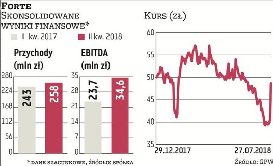 Wzmożony popyt na papiery Forte był odpowiedzią inwestorów na wyraźnie lepsze od oczekiwań wstępne szacunkowe wyniki kwartalne. Spółka pozytywnie zaskoczyła wynikiem EBITDA, notując znaczną poprawę rentowności. Marża EBITDA wzrosła w II kwartale do 13,4 proc. z 9,6 proc. rok wcześniej.